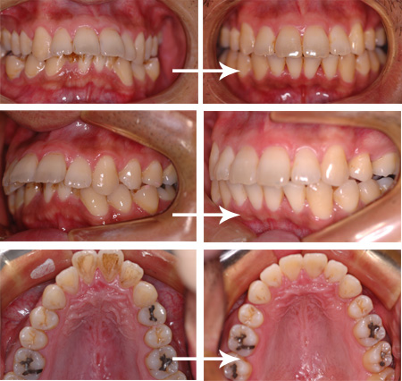 出っ歯の症例です。歯列矯正で、せり出した前歯がきれいな歯並びになったのが3枚目の写真からもわかります。